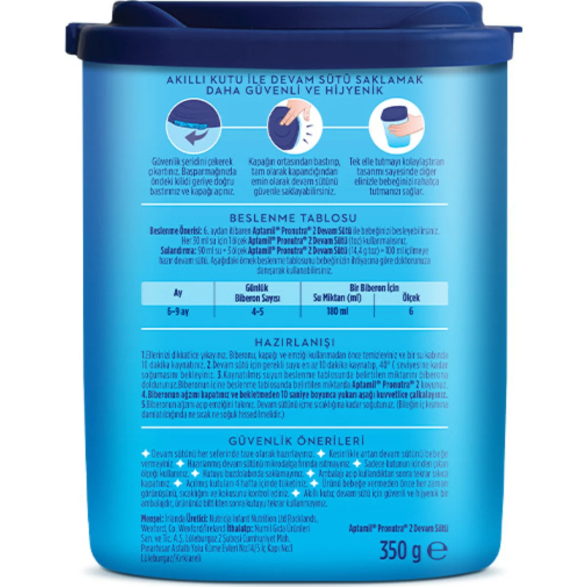 Yeni Aptamil 2 Devam Sütü.Anne sütü, bebekler için en iyi ve en doğal besindir.Zamanında doğan tüm sağlıklı bebeklerin besin ihtiyacını ilk 6 ay tek başına karşılar.2 yaşına kadar bebeğinizin bağışıklığını güçlendiren en üstün besin anne sütüdür.Aptamil Devam Sütü’nde bulunan Avrupa Patentli Pronutra ADVANCE.bebeğinizin özel beslenme ihtiyaçlarını karşılamak amacıyla geliştirilmiştir.Yeni Aptamil Devam Sütü içeriğindeki Avrupa patentli prebiyotik karışımı sayesinde bağışıklık sistemini desteklemeye yardımcı olan yararlı bakterilerin gelişimini sağlar ve yaşamasını destekler.Aptamil 2 Devam Sütü'nün 250 g, 350 g, 800 g, 900 g, 1000 g ve 1200 g olmak üzere 6 ürün boyu bulunmaktadır.Aptamil 2 Devam Sütü’nün içeriğinde, balık yağı kullanıldığın
