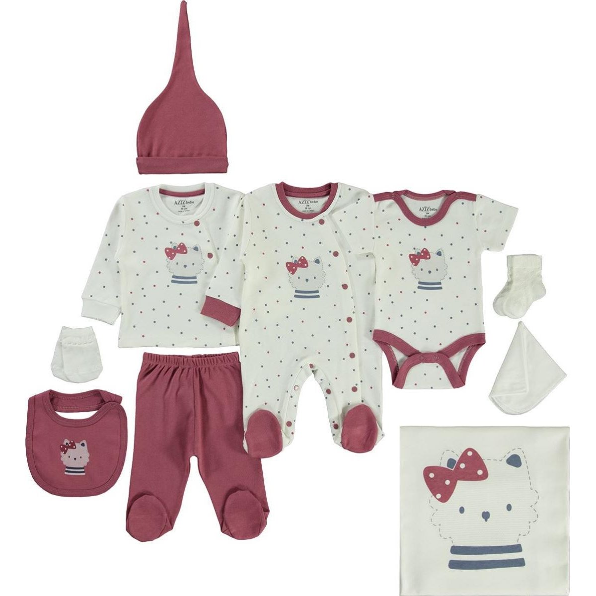 Aziz Bebe 10 Parça Hastane Çıkış 10274 Özellikleri;Aziz bebe ürünlerinde hiç bir şekilde kanserojen madde yoktur.Kumaşlarımız doğal pamuk ipliği kullanılarak sanforize edilmiştir.%100 Pamuk kumaştan üretilmiştir.Paket İçeriği:1 adet sweat1 adet pantolon1 adet tulum1 adet body1 adet şapka1 adet eldiven1 adet çorap1 adet mama önlüğü1 adet temizleme bezi1 adet battaniye olmak üzere toplam 10 parçadan oluşmaktadır.Yıkama Talimatı:Kullanmadan önce yıkayınız.Makinada ılık suda yıkayınız.Ağartıcı kulla...