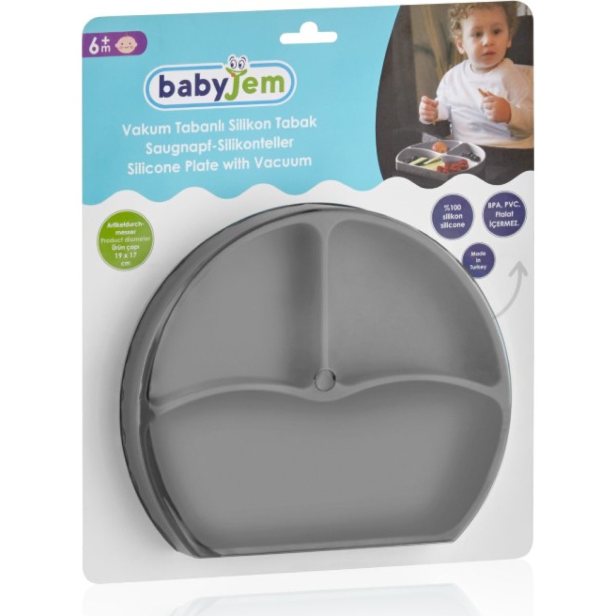 Babyjem vakumlu mama tabağı, tabanı masaya yapışarak bebeğin tabağı kaldırmasını ve dökülmesini önler.Vakumlu tabanı sayesinde, koyduğunuz yerde sabit olarak durur ve bebeğinizi kolaylıkla beslemenizi sağlar.Vakumlanmış tabağı kaldırmak için lastik kısmından kuvvetlice çekiniz.Dayanıklı ve zararlı olmayan malezemeden üretilmiştir.Bulaşık makinesinde yıkanabilir.Kırılmaya dayanıklı polipropilen malzemeden üretilmiştir.Kullanmadan önce sabunlu sıcak su ile yıkayınız ve durulayınız.Ürünü bebeğe vermeden önce herhangi bir hasar belirtisi olup olmadığını kontrol ediniz.Bu ürünü daima yetişkin gözetimi altında kullanınız....