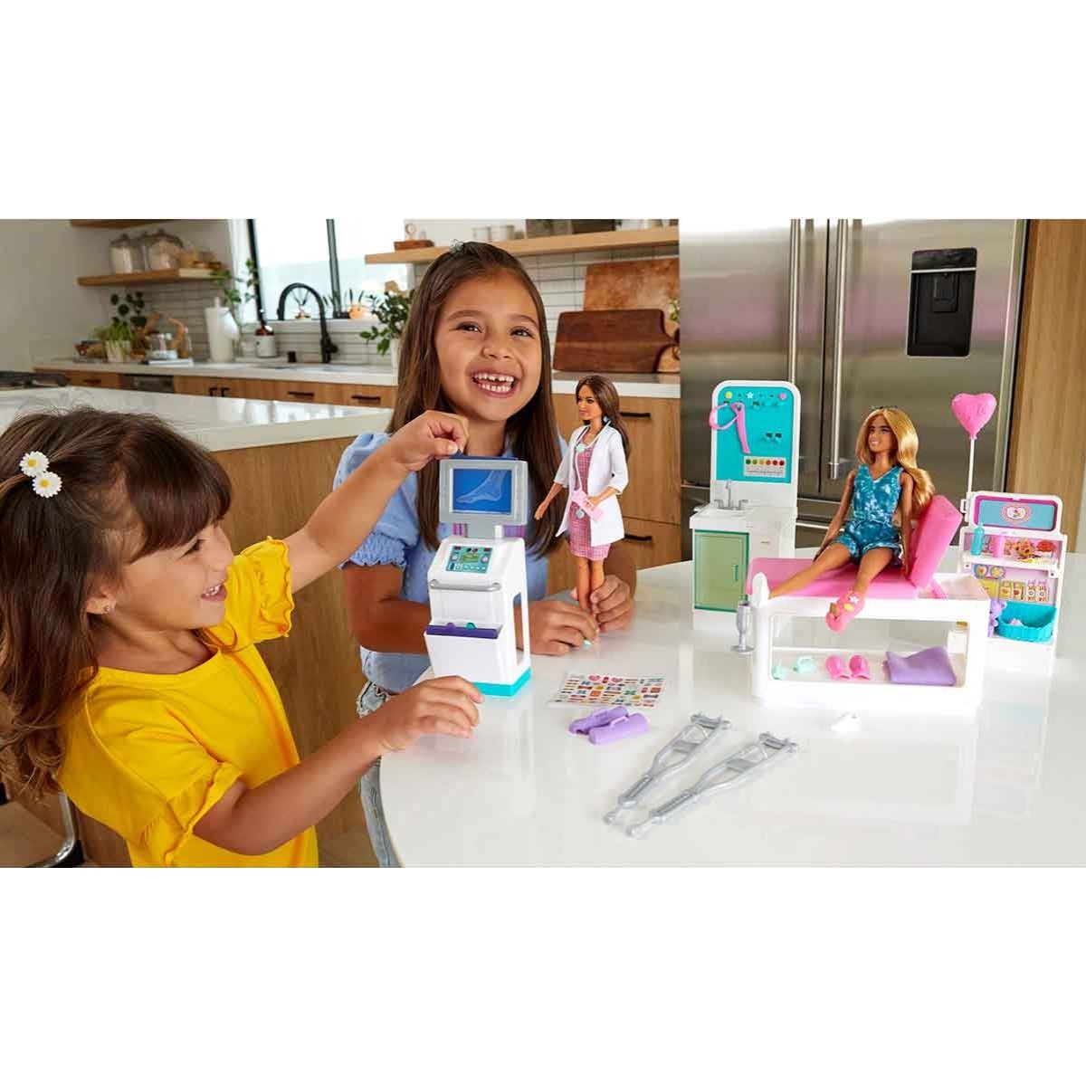 Çok sayıda kariyer, çok sayıda seçenek!Barbie Kariyer Bebekleri ve oyun setlerinin tamamını koleksiyonunuza ekleyerek gelecek ile ilgili hayal kurabilirsiniz.Barbie ile her şey mümkün!Kızlar, Barbie ile oynarken istedikleri her şeyi hayal edebilir ve hastalarla ilgilenmeyi seven kızlar Poliklinik işletebilir!Klinikte esmer Barbie Doktor Bebek (30 cm) ve 4 oyun alanı bulunur; sağlık istasyonu, muayene masası, röntgen makinesi ve hediyelik eşya dükkanı.Kızlar, gerçekçi alçı yapma özelliği ile hast...