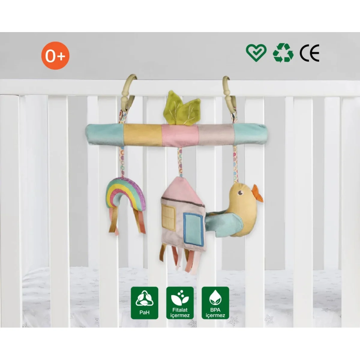 Pratik dönence.bebeklerin her anında eğlenmesi için yol arkadaşı!Üzerindeki esnek ve güçlü halkalar sayesinde birçok zemine tutunmasını sağlar.Üzerindeki renkli teması ve farklı şekillerdeki oyuncakları sayesinde bebeklerin parmak kaslarını ve kavrama hareketlerini geliştirir.Oyuncağın üzerindeki tasarımlar minik eller için özel olarak üretilmiştir.Özel tasarım kumaşıyla bebeğinizin dokunuşlarında rahatlık ve güven hissi sunar.Hafifliği sayesinde bebekler tarafından kolayca tutulabilir.Böylece arabada, oto koltuğunda ve tüm seyahatlerde onlara eşlik eder.Özel olarak tasarlanan pratik dönence oyuncağının kumaşı yıpranmalara karşı dayanıklı ve sağlamdır.Temizlik:Nemli bir bez yardımı ile kolayca temizlenir.Çamaşır makinesinde yıkanmaz.Uyarı:O