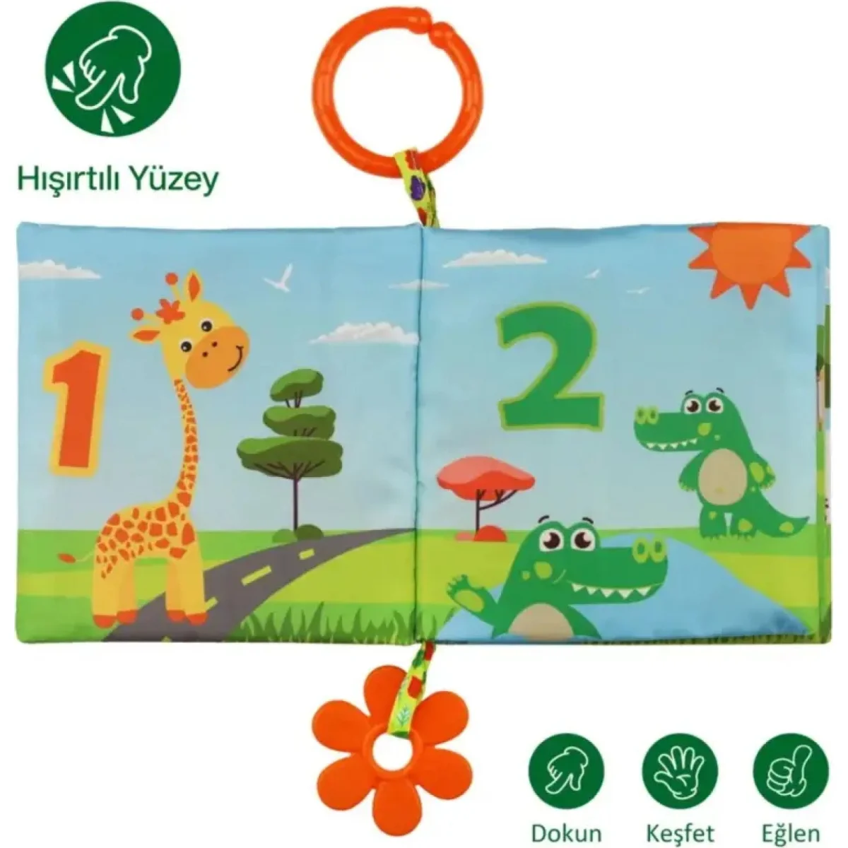 Been Dişlikli Kancalı Hışırtılı İlk Aktivite Kitabım • Kitap sevgisi aşılayarak, kitap okuma alışkanlığına zemin hazırlar.• Özel teması bebeklerin uzanma, kavrama, işitme ve parmak kaslarını geliştirmesine yardımcı olur.• Canlı renkleri ve yumuşak aynası sayesinde, bebeklerin görme ve dikkat yetisinin gelişmesine yardımcı olur.• Her sayfaya özel temalarda yer alan rakamlar, sayılar, renkler ve hayvanlar bebeğin aktivite yeteneğini kazanmasını sağlar.• Güçlü hışır sesleri sayesinde bebeğin duyma duyusunun da gelişmesini sağlar.• Mama sandalyesinde oturan bebeğin yemek yeme süresini daha eğlenceli hale getirir.• Üzerindeki kanca sayesinde bebek arabası, oto koltuğu, mama sandalyesi, beşik gibi birçok yere kolayca tutturulabilir ve her an bebeğinize....