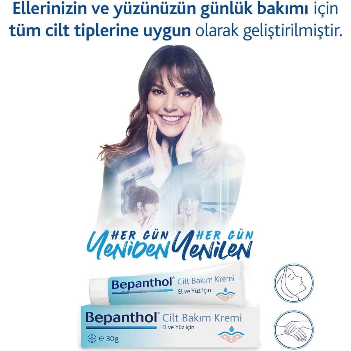Bepanthol Cilt Bakım Kremi günlük el ve yüz bakımı için geliştirilmiştir. Dış etkenler nedeniyle, cilt kuruluğuna bağlı pul pul dökülen, çatlayan ve gerginleşen cildi nemlendirerek korur.İçeriğindeki ProVitamin B5 sayesinde cildi nemlendirir ve cilt bariyerini dış etkenlere karşı korur.Yumuşak ve hafif dokusuyla hızlı emilir ve cilde serinlik hissi verirken yağlılık hissi bırakmaz.Parfüm, renklendirici, paraben içermez....