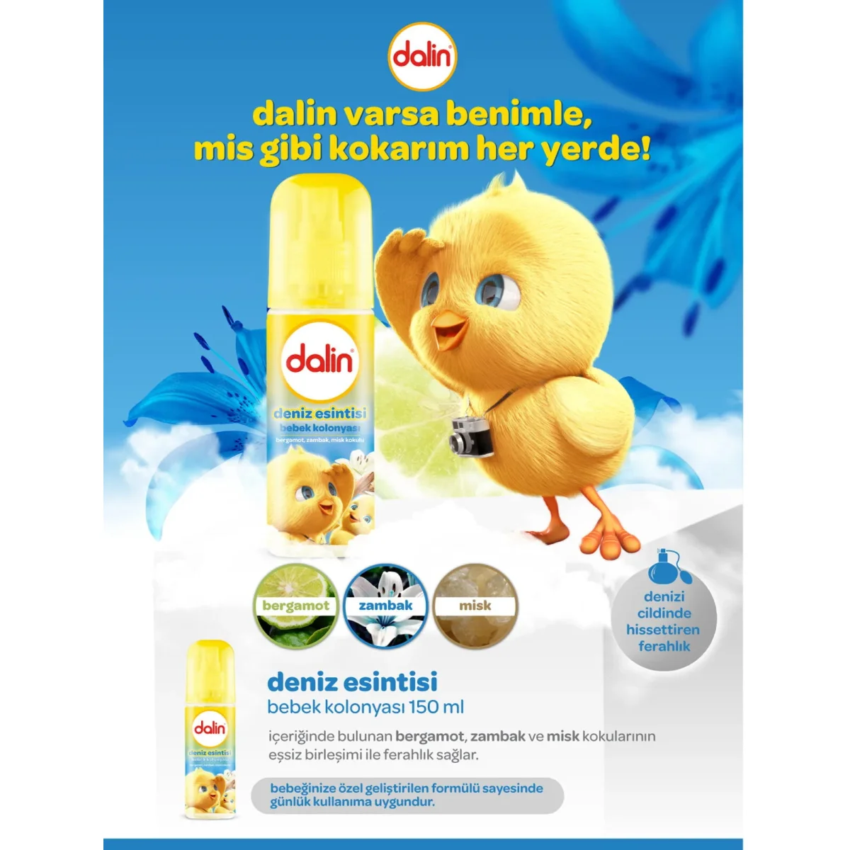 Dalin Deniz Esintisi Kolonya 150 ml İhtiyacınız olan her an kullanılan Dalin kolonya ferah bir etki bırakır.Ürün, 150 ml şişe boyutlarıyla istediğiniz her yere kolay taşıyabilme olanağı sunar.Bebeğinizin cildine uygun olarak üretilir.Ürün, dermatolojik olarak test edilir.Dalin Kolonya İçeriği Şunları içerir: Dengeli pH, hafif deniz esintisi kokusu ve ferahlatıcı etki.Şunları içermez: Alkol, paraben, boya ve sert kimyasallar.Dalin Kolonya Özellikleri Dalin kolonya, alkol içermeyen yapısı sayesinde cildi kurutmaz.Dalin kolonya deniz esintisi aroması ile ferah bir koku bırakır.Paraben ve boya içermeyen doğal bir içeriğe sahiptir.Banyo sonrasında, kıyafetlerin üstüne veya ihtiyacınız olan her an kullanım sağlayabilirsiniz.Dalin kolonya, bebeğinizin....