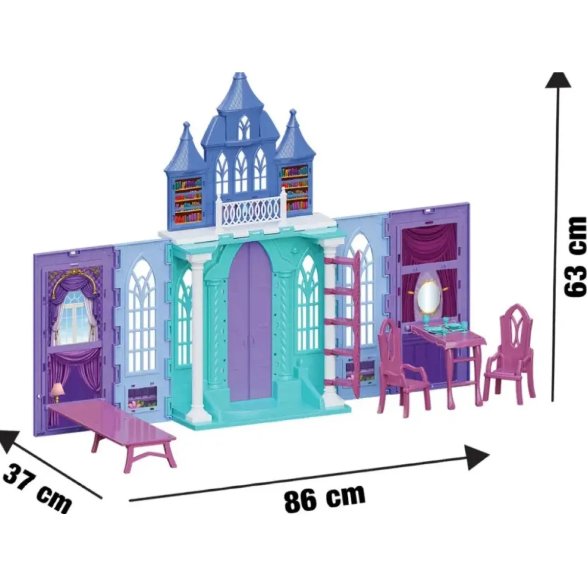 Prensesler, şatoda yaşar!Şatonun kapıları açılıyor, prensesler yeni evine kavuşuyor. Bu çok mu çok havalı şatoda krallığın en güzel ve en cesur prensesleri yaşıyor. Açıldığında 86 cm’ye ulaşan uzunluğu ile eğlence katlanarak artıyor! Sabah uykusundan uyanan krallığın şimdiye dek gördüğü en güzel prensesi masasında yemekler yiyor, pencereden dışarıyı izliyor ve kütüphanenin de bulunduğu kata çıkarak balkonda keyifli vakit geçiriyor. Üstelik tüm bu eğlenceli anlara çok şık giyinmiş prenses bebek bizzat kendisi eşlik ediyor!Buzlar Kraliçesi Şatosu Oyun Seti sayesinde minik kızlar set içerisinde yer alan prenses bebeği ile birlikte büyüleyici bir maceraya yelken açıyor. Masa, sandalye, tabak ve bardak gibi şato aksesuarlarını diledikleri gibi yerleştiren....
