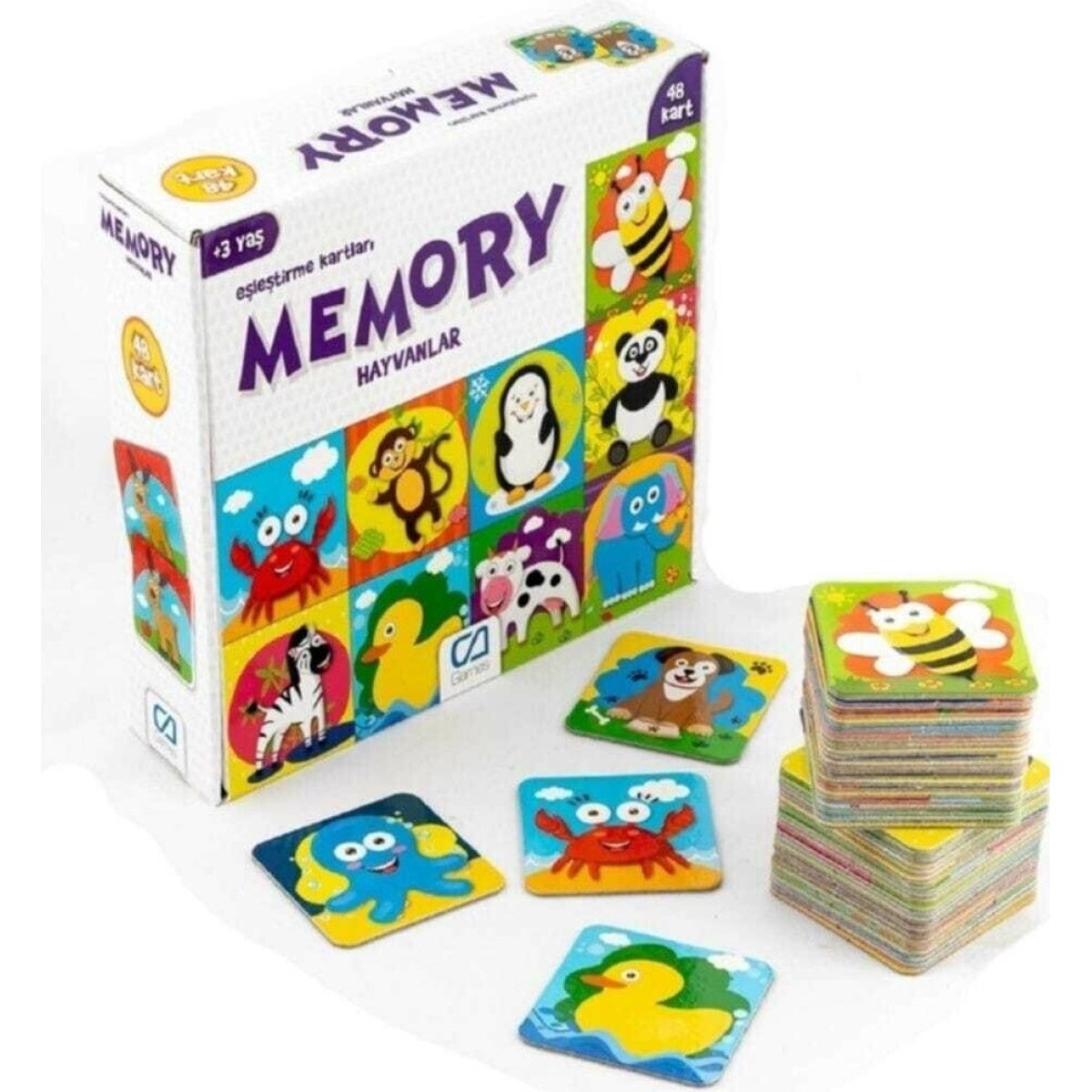 Hafıza Kartları serisinden Hayvanlar temalı oyun kartları sizlerle!48 oyun kartından oluşan eşleştirme kartları ile minikler eğlenceli dakikalar geçirecekler! Hafıza oyunu için, konsantrasyon, dikkat ve görsel hafıza gereklidir. Küçük oyuncuların, büyük oyuncuları alt edebileceği heyecanlı kart eşleştirme avına hazırsanız, hemen başlayın!Oyunun Amacı: En çok kartı eşleştirmeye çalışmaktır. Oyunun sonunda en çok çifte sahip olan oyunu kazanır.Kartlar resim yüzeyleri aşağıda olacak şekilde kapalı karıştırılır. Kartlar isteğe göre kare veya dikdörtgen şeklinde aralarında boşluk bırakarak dizilebilir.Kartlar dizildikten sonra yerinden oynatılmamalıdır.Oyuna Kim Başlar? Oyuna, yaşı en küçük oyuncu başlar, oyuncular saat yönünde kartların etrafın