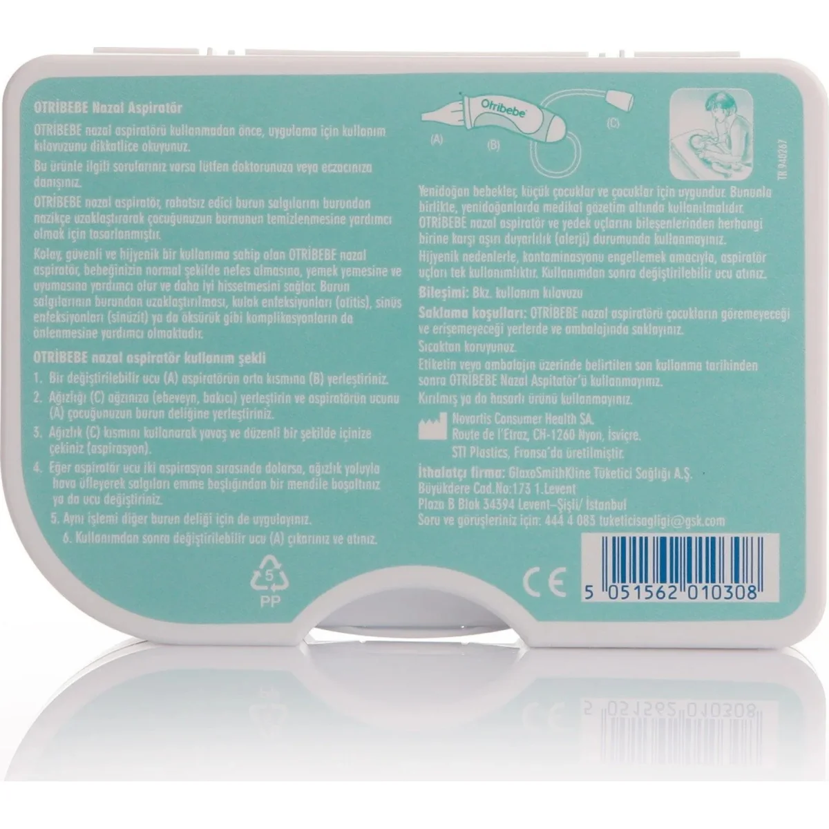 Otribebe Nazal Aspiratör ve yedek uçlar: Burnun tıkanmasına yol açan burun salgısının burundan kontrollü aspirasyon yardımı ile temizlenmesi için geliştirilmiş medikal bir cihaz olan Otribebe Nazal Aspiratör ağızlık, esnek silikon bir tüp, aspiratörün sabit tutulmasına yarayan sert bir gövde ve bebeğin burun deliğine uygun tasarlanmış sünger filtreli şeffaf anatomik uçtan oluşur.Otribebe Nazal Aspiratör'ün tek kullanımlık anatomik uçları burun salgısının cihaza geçmesini önlemek için sünger bir filtre içerir.Otribebe Nazal Aspiratör, bir kutu içerisinde 2 adet tek kullanımlık yedek uç ile birlikte satılır.Sonraki kullanımlar için 10'lu yedek uç kutuları ayrıca satın alınabilir.Nasıl Kullanılır?Otribebe’nin özgün temizleme yönteminin adımları....