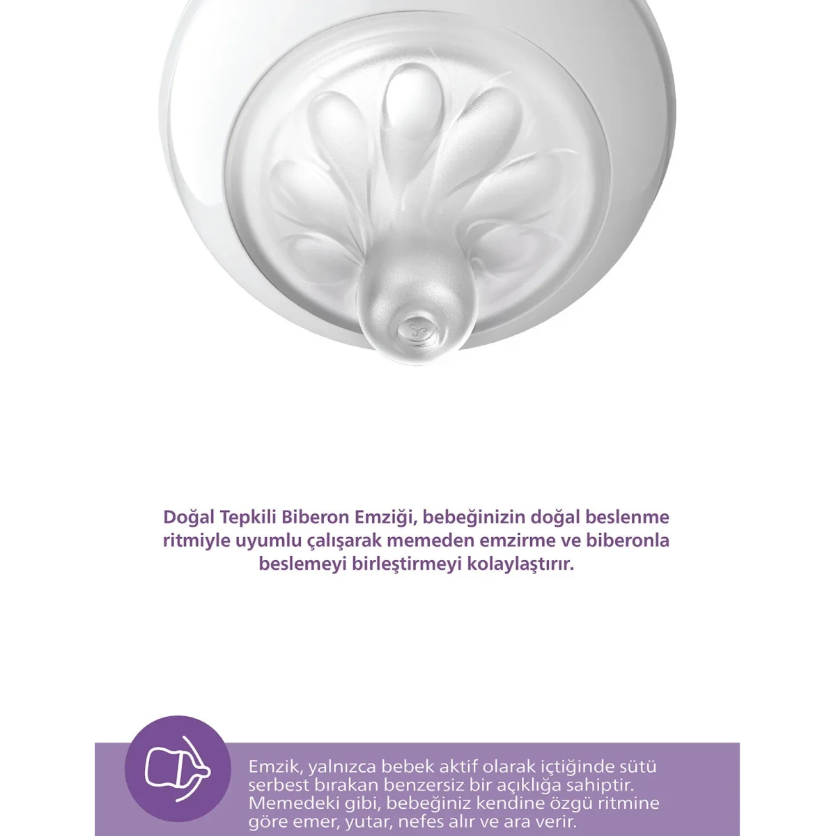 Philips Avent Natural Response PP Biberon 260 ml Philips Avent Natural Response PP Biberon, bebeğinizin doğal emme ritmine uyum sağlayarak anne göğsüne yakın bir beslenme deneyimi sunmak için tasarlanmıştır.Doğal tepkili 3 numaralı emzik ucu, yalnızca bebek emdiğinde akış sağlayan akıllı yapısı sayesinde kontrolü bebeğinize bırakır.Antikolik valf yapısı gaz oluşumunu azaltmaya yardımcı olurken, ortodontik tasarım ve BPA içermeyen polipropilen (PP) malzeme hem güvenli hem de sağlıklı kullanım sağlar.260 ml hacmiyle 3–6 aylık bebekler için ideal bir biberon çözümüdür.Philips Avent Natural Response PP Biberon 260 ml Özellikleri Doğal beslenme hissi: Doğal Tepkili 3 numaralı emzik ucu, anne göğsünü andıran emme deneyimi sunar.Akıllı akış sistemi:....