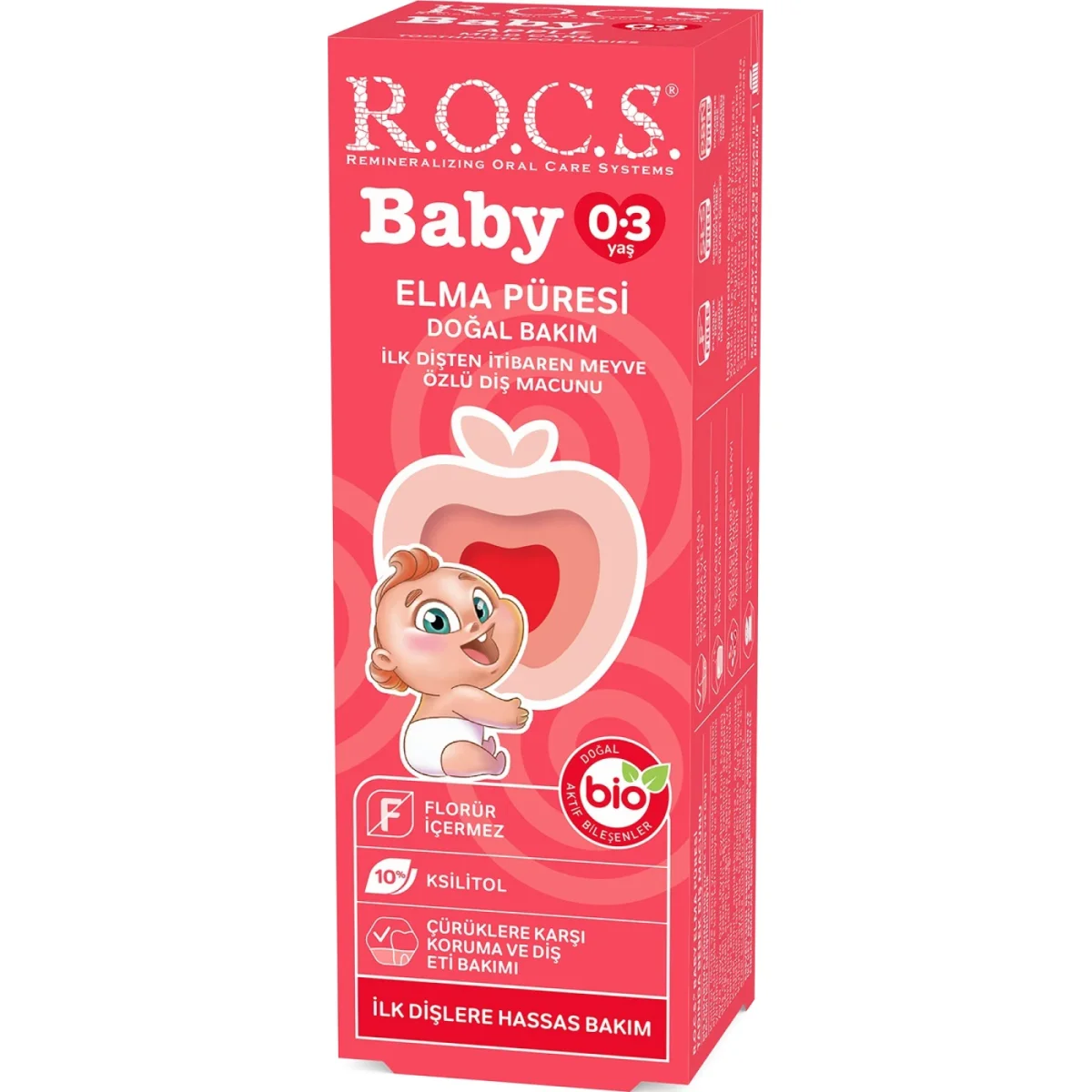 İlk dişin çıkmasından itibaren kullanılabilir.Bebeklere özel formülü diş çürüklerine yol açan bakterileri engeller.Diş minesinin doğal mineralizasyonunu destekleyerek güçlendirir.Ihlamur, elma ve papatya özleri ile diş patlama döneminde iltihap giderici etki göstererek bebeği rahatlatır.Yutulabilir özellikte olduğundan florid, sodium lauryl sulphate, paraben, yapay tatlandırıcı ve renklendirici içermez.0-3 Yaş .