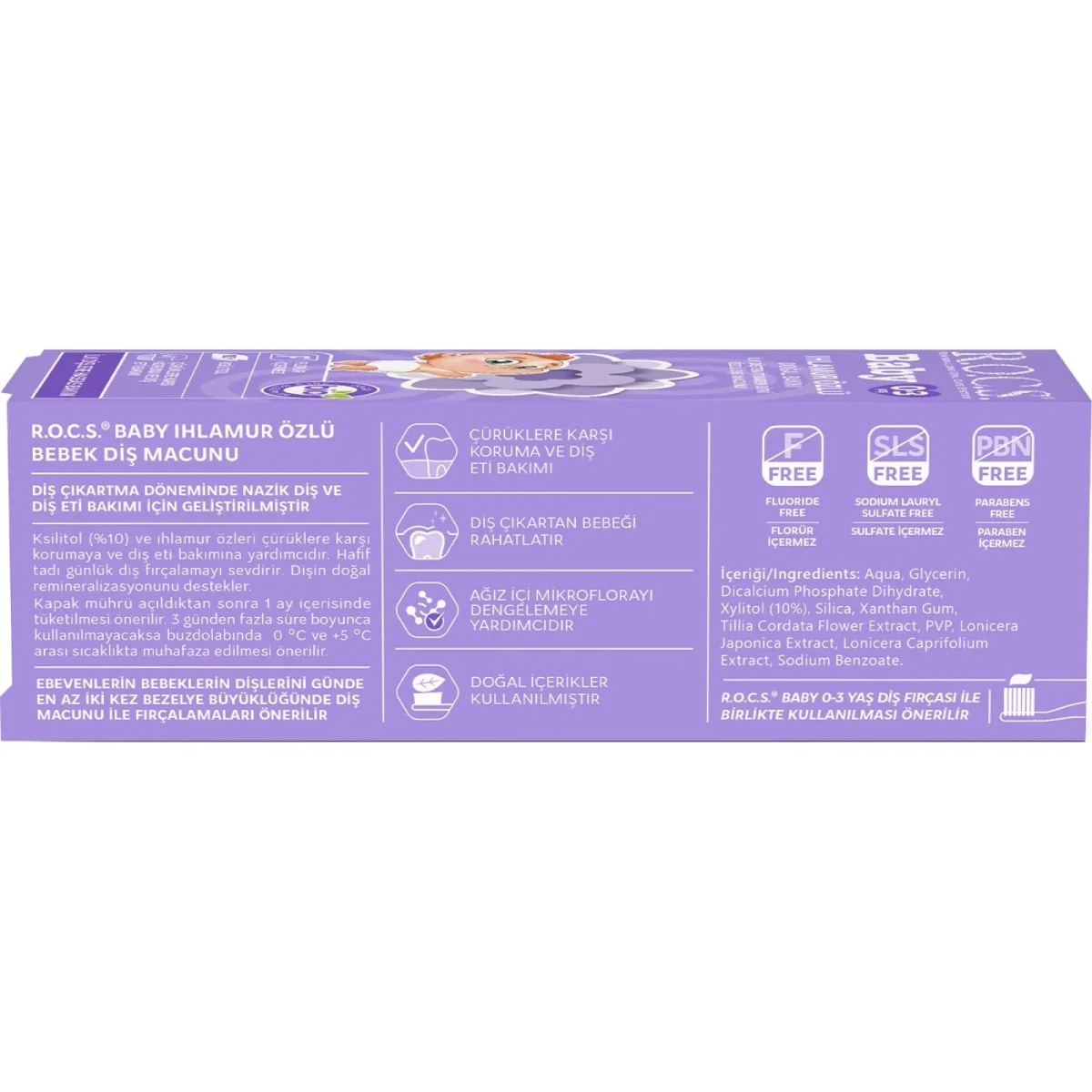İlk dişin çıkmasından itibaren kullanılabilir.Bebeklere özel formülü diş çürüklerine yol açan bakterileri engeller.Diş minesinin doğal mineralizasyonunu destekleyerek güçlendirir.Ihlamur ,elma ve papatya özleri ile diş patlama döneminde iltihap giderici etki göstererek bebeği rahatlatır.Yutulabilir özellikte olduğundan florid, sodium lauryl sulphate, paraben, yapay tatlandırıcı ve renklendirici içermez.0-3 Yaş.