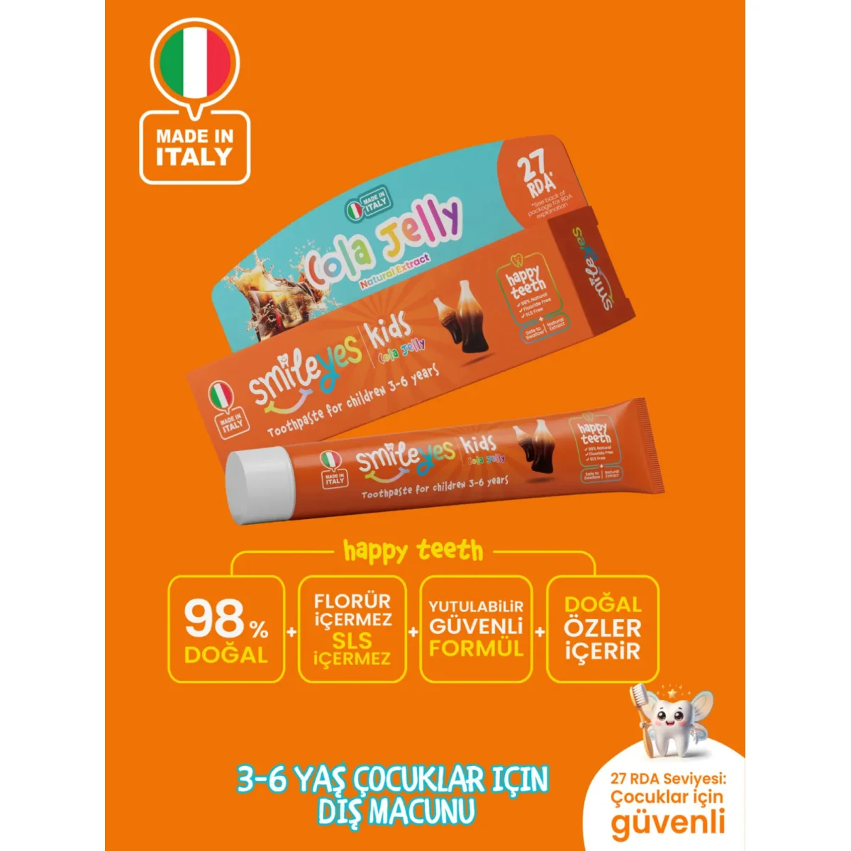 Florürsüz ve SLS içermeyen formülüyle çocuklarınızın diş sağlığını güvenle destekler.Ürünlerimiz İtalya'da üretilmiş ve bağımsız laboratuvarlarda test edilmiştir.Karışık meyve aroması, çocukların diş fırçalamayı sevmesine yardımcı olur ve düşük aşındırıcılık seviyesi olan 27 RDA ile dişlerini nazikçe temizler.Doğal ve Güvenli: %99 doğal içerikler ve laboratuvar onaylı formül.Eğlenceli Diş Fırçalama: Doğal karışık meyve aroması, çocukların diş fırçalamayı eğlenceli hale getirir.Florür ve SLS İçermeyen Güvenli Formül: Güvenle kullanılabilir, yutulabilir.Düşük Aşındırıcılık (27 RDA): Hassas diş minesini korur ve nazik temizlik sağlar.İtalya'da Üretilmiştir: Yüksek kalite standartlarına uygun olarak İtalya'da formüle edilmiştir.