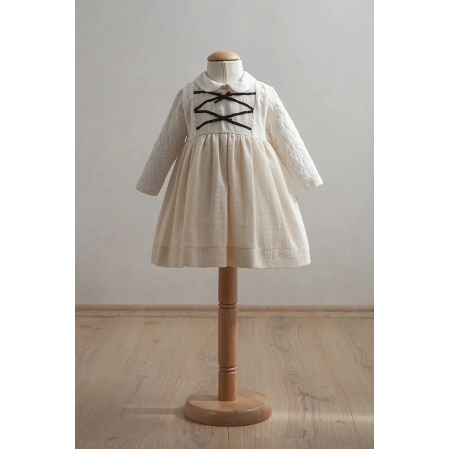Ekru rengin zarafetini siyah kurdele detayları ve Peter Pan yaka tasarımıyla birleştiriyor. Dantel detaylı uzun kollar.Elbiseye ince bir dokunuş katarak hem günlük kullanım hem de özel günler için ideal bir seçenek haline getiriyor. Üst kısmında %100 pamuk kumaş kullanılarak bebeğinizin hassas cildi için yumuşak bir deneyim sağlanmıştır. Alt kısmında %91 pamuk.%7 polyester ve %2 elastan karışımı kumaş.Esnek ve dayanıklı bir yapı sunar. Göğüs kısmındaki çapraz siyah kurdele detayları.Yaka çevresindeki siyah şerit dokunuşu elbiseye sofistike bir görünüm kazandırır. Dantel detaylı kollar ve yumuşak kumaşı.Bebeğinizin gün boyu rahat hissetmesini sağlar. Hem hareket özgürlüğü hem de şıklık sunan bu tasarım.Bebeğinizin gardırobunda fark yaratacak....