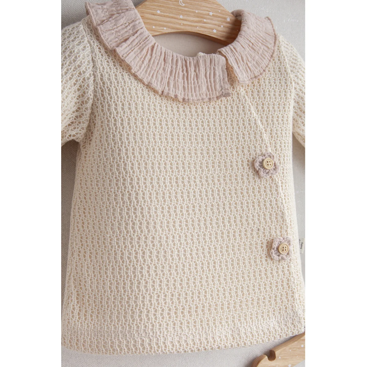 Tongs Baby Daisy Dream 5'li Zıbın Set 5464 Özellikleri, Uzun Kollu Üst:Yandan çapraz tasarımıyla benzersiz bir stil sunar. Bebek yakası, ince dantel detayları ve zarif çiçek desenli ahşap düğmeleri ile dikkat çeker. Alt Takım:Esnek bel bandı ve ayaklı tasarımı sayesinde bebeğinizin rahatça hareket etmesini sağlarken sıcak tutar. Şapka:Baş kısmını koruyan yumuşak dokusu, estetik bir görünüm sunan küçük çiçek düğme detayıyla tamamlanır. Önlük:Bebeklerin temizliğini korumak için işlevsel ve tasarımıyla zariftir. İnce örgü detayları dikkat çeker. Eldiven:Yumuşak ve elastik tasarımıyla bebeklerin hassas ellerini sıcak tutar ve çizilmeleri önler. Yandan çapraz düğme kapaması hem estetik bir dokunuş hem de kolay kullanım sağlar. Bebe yakası.Dantel....
