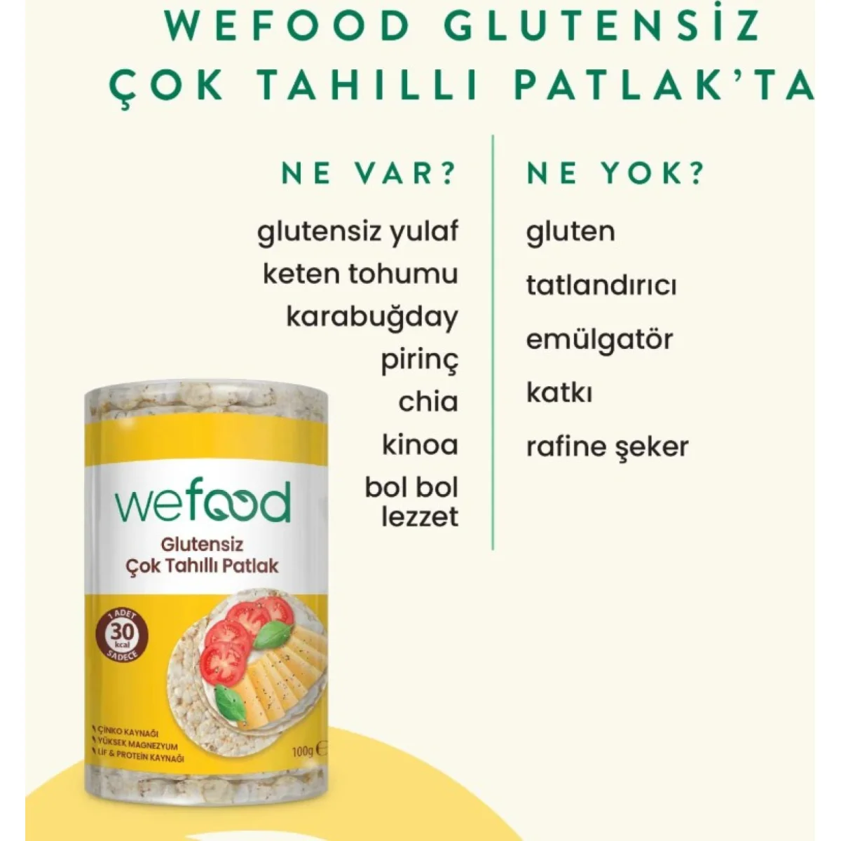 Wefood Çok Tahıllı Patlak 100 gr Özellikleri;Her insan zaman zaman atıştırmalık ihtiyacı duyuyor.Peki, bu ihtiyacı ilave şeker ve yağ içermeyen çıtır çıtır bir patlakla giderebileceğinizi söylesek ne düşünürsünüz?Wefood Çok Tahıllı Patlak, yüksek lif içeriği sayesinde uzun süre boyunca tok kalmanıza yardımcı oluyor.Aynı zamanda içeriğindeki arpa, çavdar, siyez buğdayı ve yulaf gibi zengin tahıllar sayesinde günün herhangi bir saatinde doğal atıştırmalık alternatifi sunuyor.Wefood vegan tüketicileri de unutmuyor! Hayvansal gıda içermeyen Wefood Çok Tahıllı Patlak, vegan bir ürün olması sayesinde hayvansal gıda tüketmeyenler de dahil tüm tüketici kitlelerine hitap ediyor.Üstelik zengin kullanım alanıyla da tatlı ve tuzlu tariflerin hazırlanmasına....
